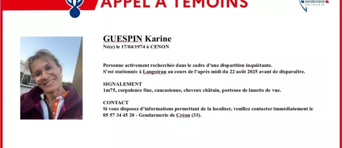 La gendarmerie de la Gironde lance un appel à témoins après la disparition jugée inquiétante d’une femme dans le secteur du Créonnais.Karine Guespin, 51 ans,...