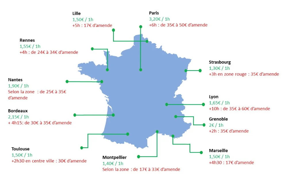 Concernant les amendes, Lyon détient la palme du forfait post-stationnement (FPS) le plus sévère, allant de 35 à 60 euros en fonction des zones, avec une limite de temps de dix heures consécutives. Viennent ensuite Paris (35 à 50 euros, jusqu'à six heures), Strasbourg et Grenoble (35 euros, jusqu'à trois et deux heures).